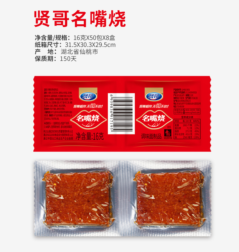 本网页所展示的有关【贤哥辣条名嘴烧小时候的味道网红零食辣条 2箱_湖北_湖北贤哥食品有限公司】的信息/图片/参数等由中华旅行网.旅行的会员【湖北贤哥食品有限公司】提供,由中华旅行网.旅行会员【湖北贤哥食品有限公司】自行对信息/图片/参数等的真实性、准确性和合法性负责,本平台(本网站)仅提供展示服务,请谨慎交易,因交易而产生的法律关系及法律纠纷由您自行协商解决,本平台(本网站)对此不承担任何责任。您在本网页可以浏览【贤哥辣条名嘴烧小时候的味道网红零食辣条 2箱_湖北_湖北贤哥食品有限公司】有关的信息/图片/价格等及提供【贤哥辣条名嘴烧小时候的味道网红零食辣条 2箱_湖北_湖北贤哥食品有限公司】的商家公司简介、联系方式等信息。