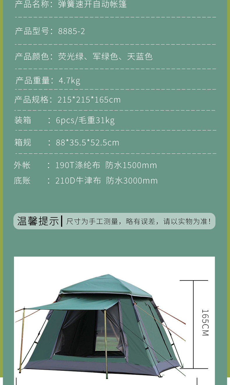 本网页所展示的有关【登山帐篷自动弹簧速开帐篷空间大加厚防暴雨户外野营露营帐篷家用2顶_帐篷_东阳市佳蕙户外用品有限公司】的信息/图片/参数等由中华旅行网.旅行的会员【东阳市佳蕙户外用品有限公司】提供,由中华旅行网.旅行会员【东阳市佳蕙户外用品有限公司】自行对信息/图片/参数等的真实性、准确性和合法性负责,本平台(本网站)仅提供展示服务,请谨慎交易,因交易而产生的法律关系及法律纠纷由您自行协商解决,本平台(本网站)对此不承担任何责任。您在本网页可以浏览【登山帐篷自动弹簧速开帐篷空间大加厚防暴雨户外野营露营帐篷家用2顶_帐篷_东阳市佳蕙户外用品有限公司】有关的信息/图片/价格等及提供【登山帐篷自动弹簧速开帐篷空间大加厚防暴雨户外野营露营帐篷家用2顶_帐篷_东阳市佳蕙户外用品有限公司】的商家公司简介、联系方式等信息。