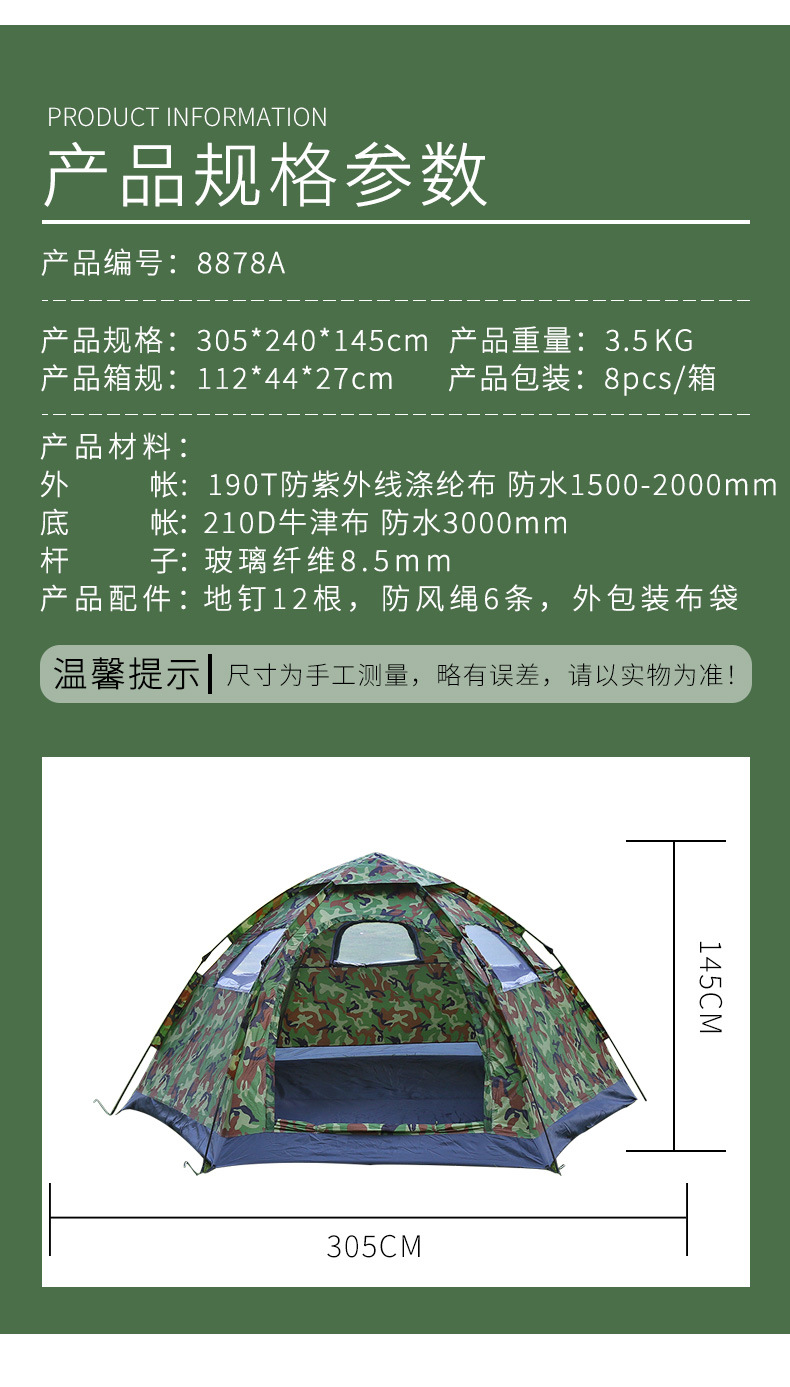 本网页所展示的有关【户外露营迷彩山地大帐篷双开门野营便携式帐篷自动速开免搭建帐篷2顶_帐篷_东阳市佳蕙户外用品有限公司】的信息/图片/参数等由中华旅行网.旅行的会员【东阳市佳蕙户外用品有限公司】提供,由中华旅行网.旅行会员【东阳市佳蕙户外用品有限公司】自行对信息/图片/参数等的真实性、准确性和合法性负责,本平台(本网站)仅提供展示服务,请谨慎交易,因交易而产生的法律关系及法律纠纷由您自行协商解决,本平台(本网站)对此不承担任何责任。您在本网页可以浏览【户外露营迷彩山地大帐篷双开门野营便携式帐篷自动速开免搭建帐篷2顶_帐篷_东阳市佳蕙户外用品有限公司】有关的信息/图片/价格等及提供【户外露营迷彩山地大帐篷双开门野营便携式帐篷自动速开免搭建帐篷2顶_帐篷_东阳市佳蕙户外用品有限公司】的商家公司简介、联系方式等信息。