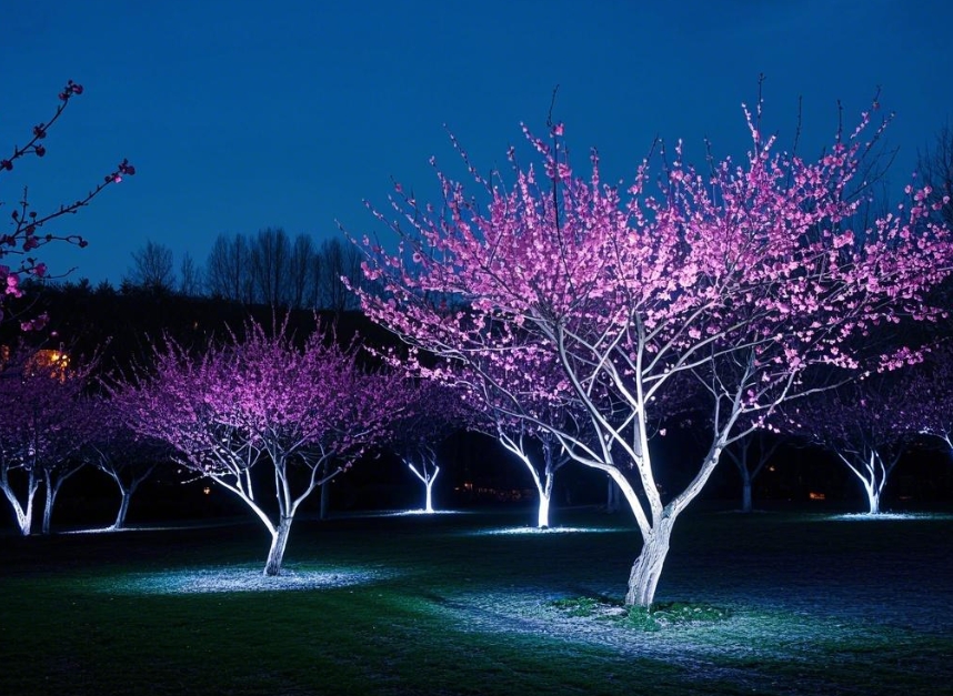 图:溧水傅家边夜间赏梅,灯光勾勒出梅林轮廓
